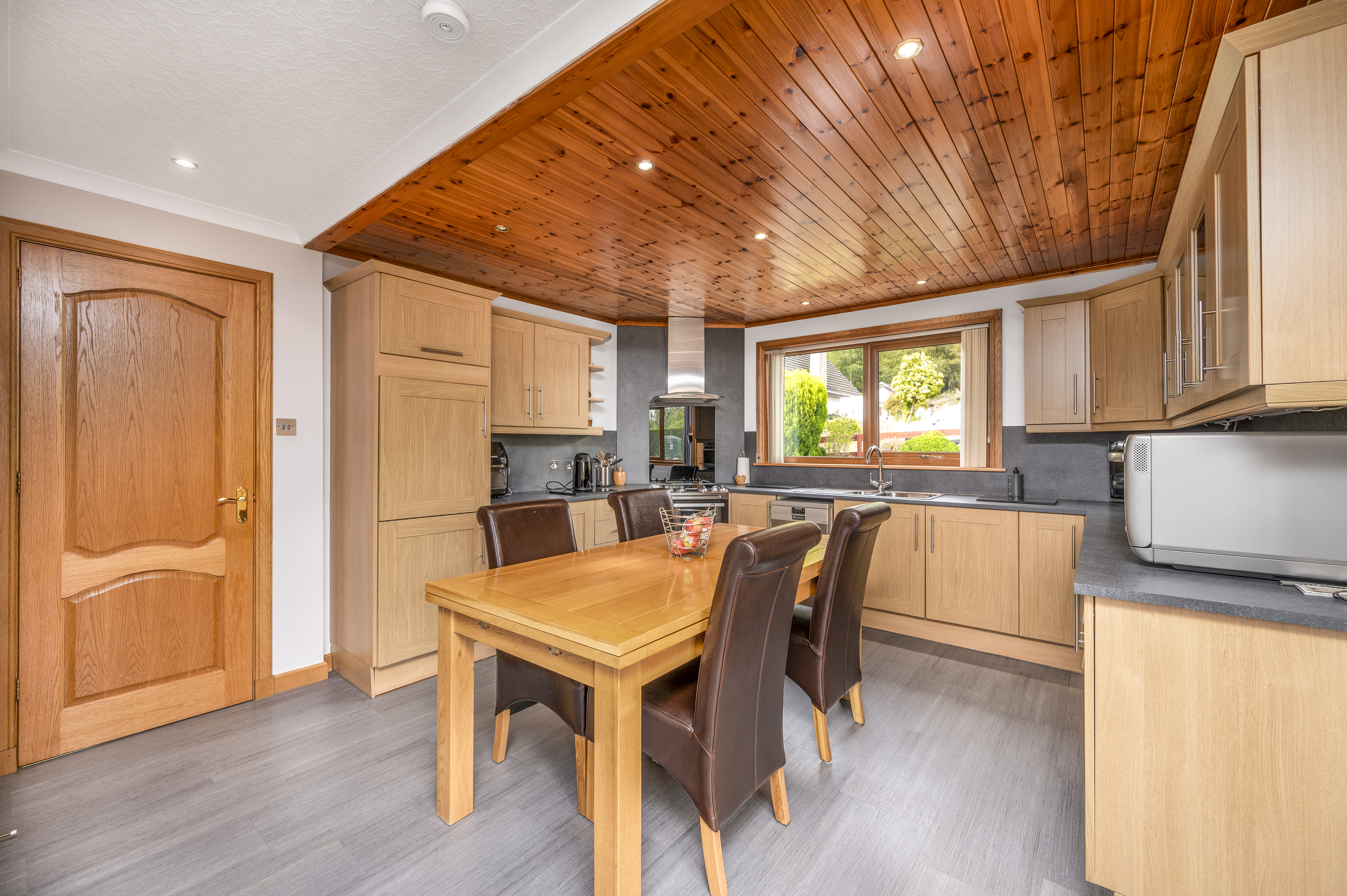 This bright kitchen/family room enjoys a double aspect with front and side facing windows, fitted with vertical blinds and allowing plenty of natural light to enter. The kitchen is fitted with a generous number of wall and base units providing plenty of storage space and incorporating a 1.5 stainless steel sink and drainer with mixer tap. Free standing cooker with stainless steel extractor hood above. Work surface with matching splash-back. Dishwasher. Large fridge freezer. The ceiling in the kitchen area has been lined with wood panelling. Ample space for a dining table and chairs. Recessed ceiling lights. Feature ceiling light in the seating area. Quality laminate flooring. Large radiator. Door leads into a very convenient laundry cupboard which enjoys slatted shelving and houses the central heating boiler and MegaFlo water tank allowing an ideal space for drying clothes. Door from the kitchen leads into the utility room.