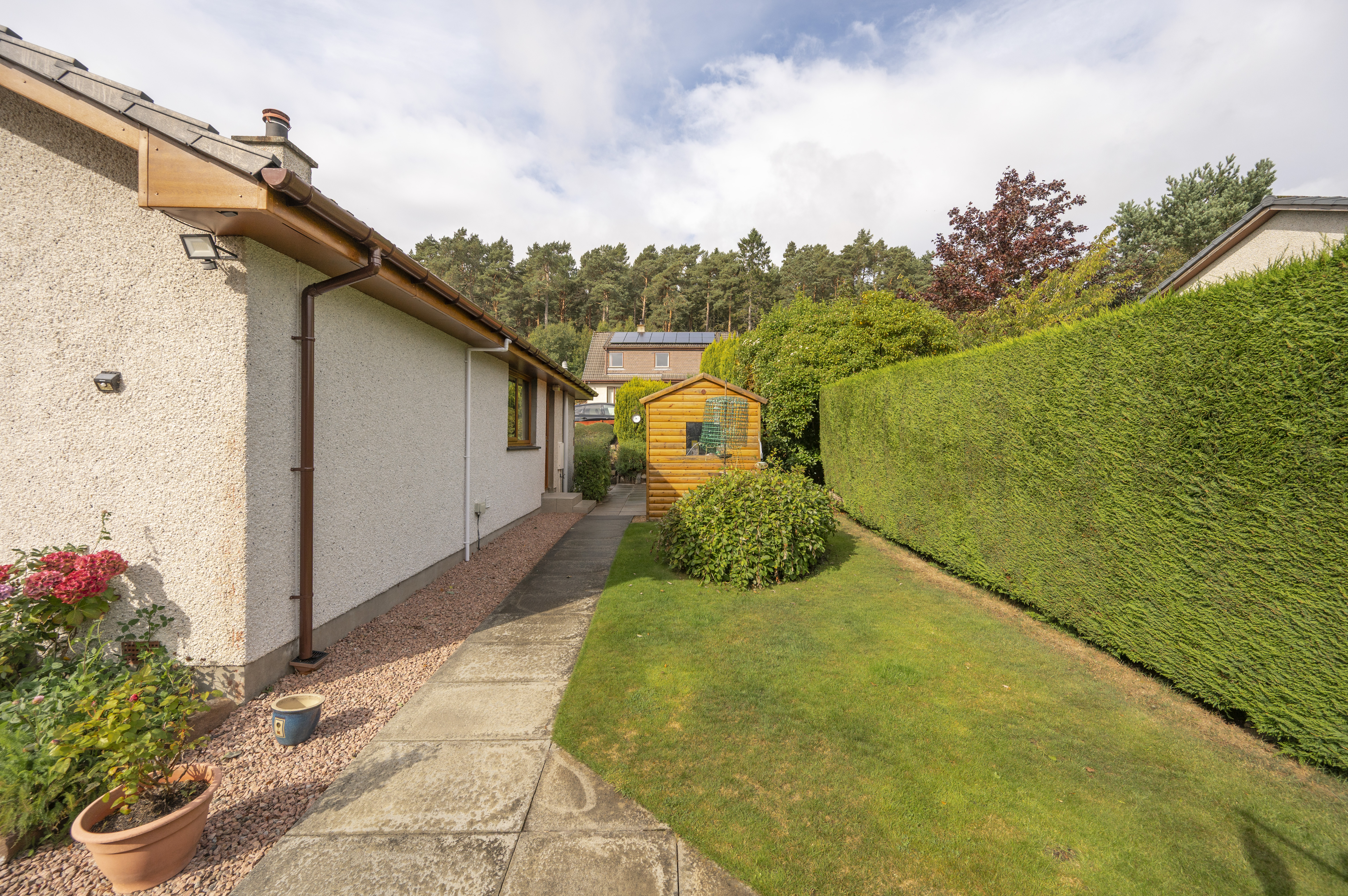 The property sits in beautifully landscaped garden ground which lies to the front, side and rear and is largely paved for easy maintenance. There is a variety of flower beds, shrubs, bushes and specimen trees, providing plenty of colour throughout the summer months. The lower garden has been landscaped and enjoys attractive paths which lead down to woodland owned by the adjacent hospital. Boundaries are of masonry walls and wire fencing. A large driveway provides parking for several vehicles.