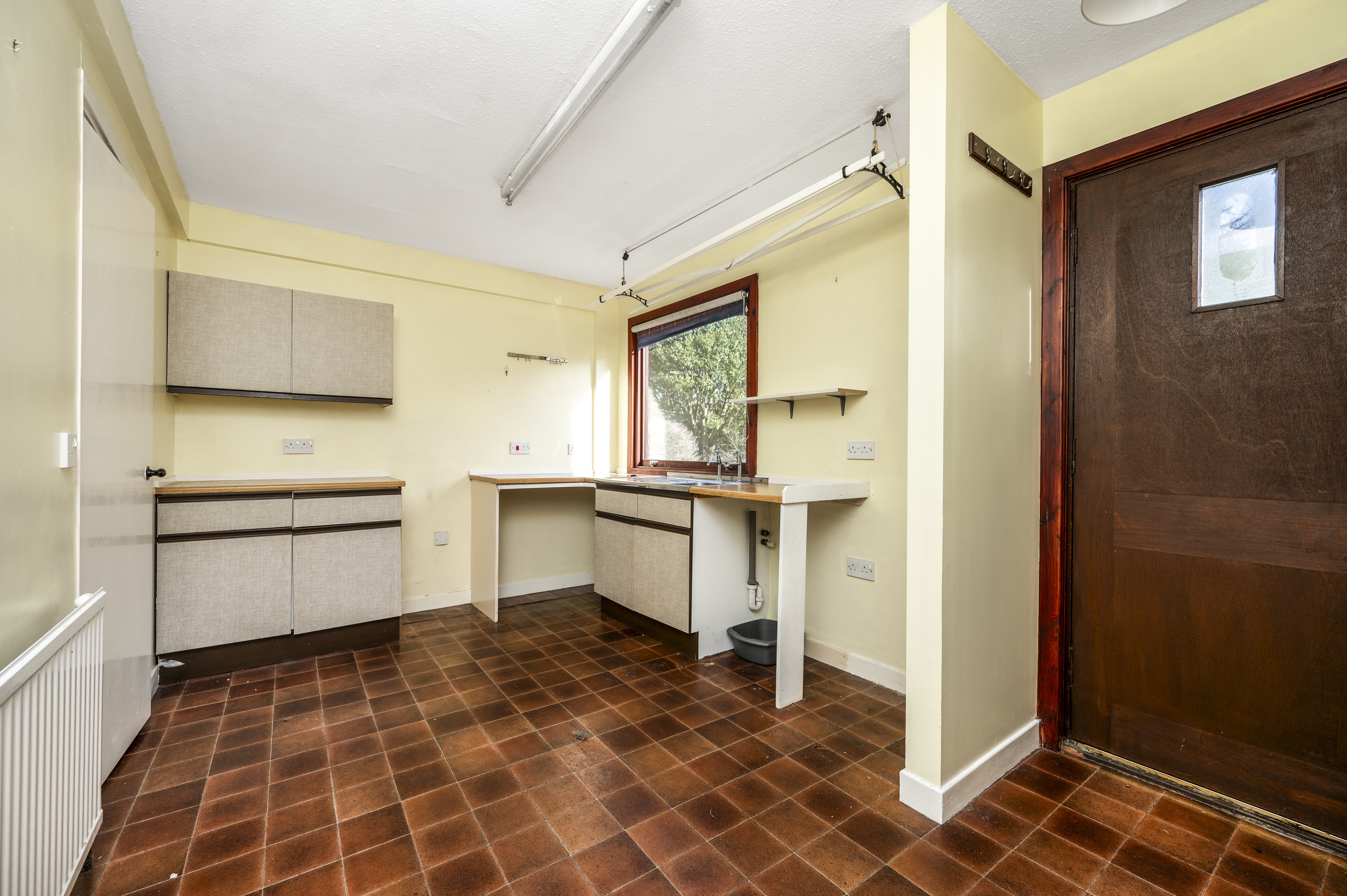This fully fitted kitchen comprises a generous amount of wall and base units providing excellent storage and incorporates a stainless steel sink and drainer. Work surface. Space for free-standing cooker. Plumbed for washing machine. Ceiling mounted clothes pulley. Vinyl flooring. Rear facing window. Radiator. External door leads out to the rear garden.