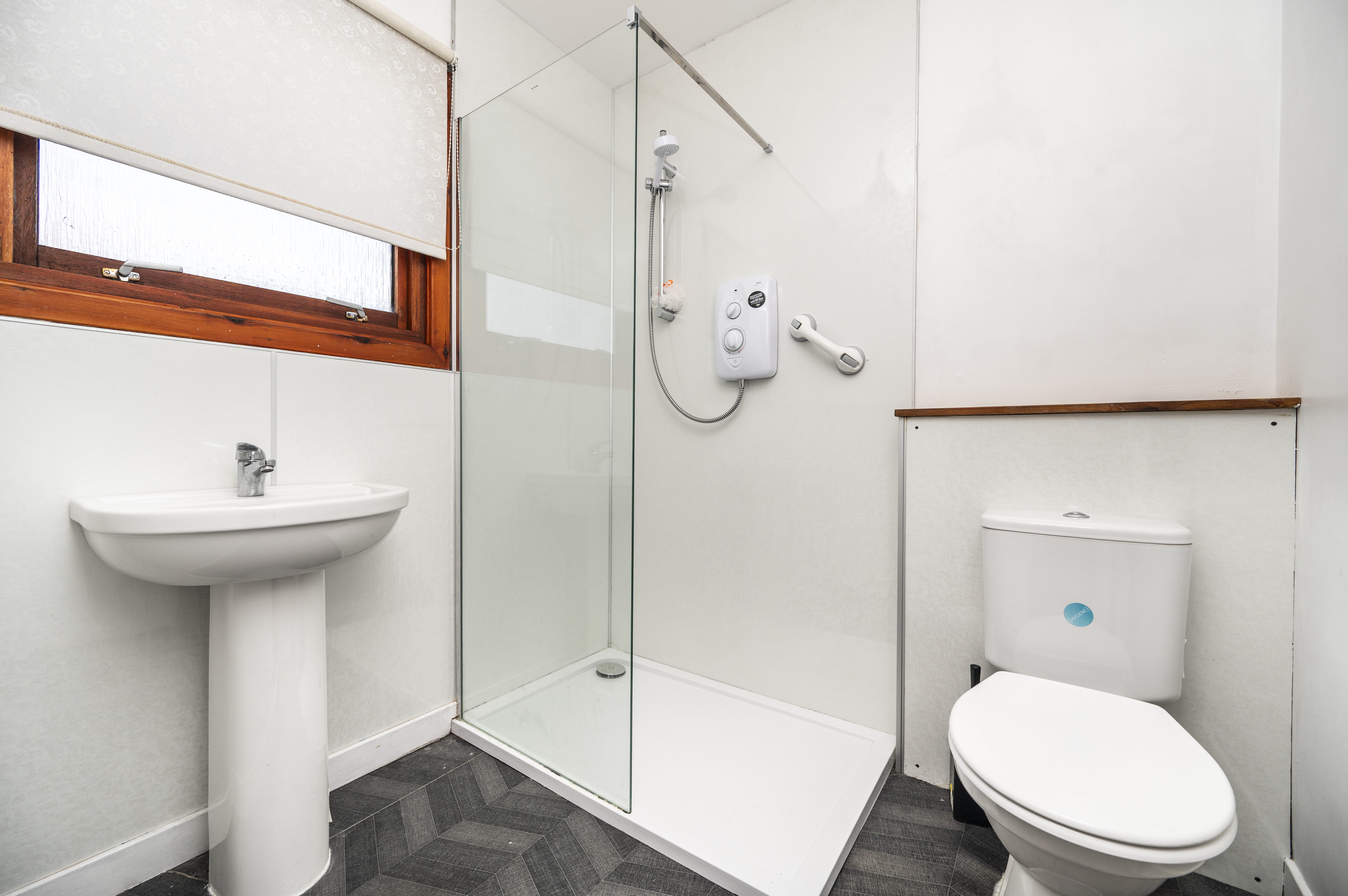 Comprising WC, wash hand basin and walk-in shower cubicle which has been fully lined with wet wall panelling and fitted with an electric Mira shower unit. Side facing window with roller blind. Non-slip flooring. Radiator.
