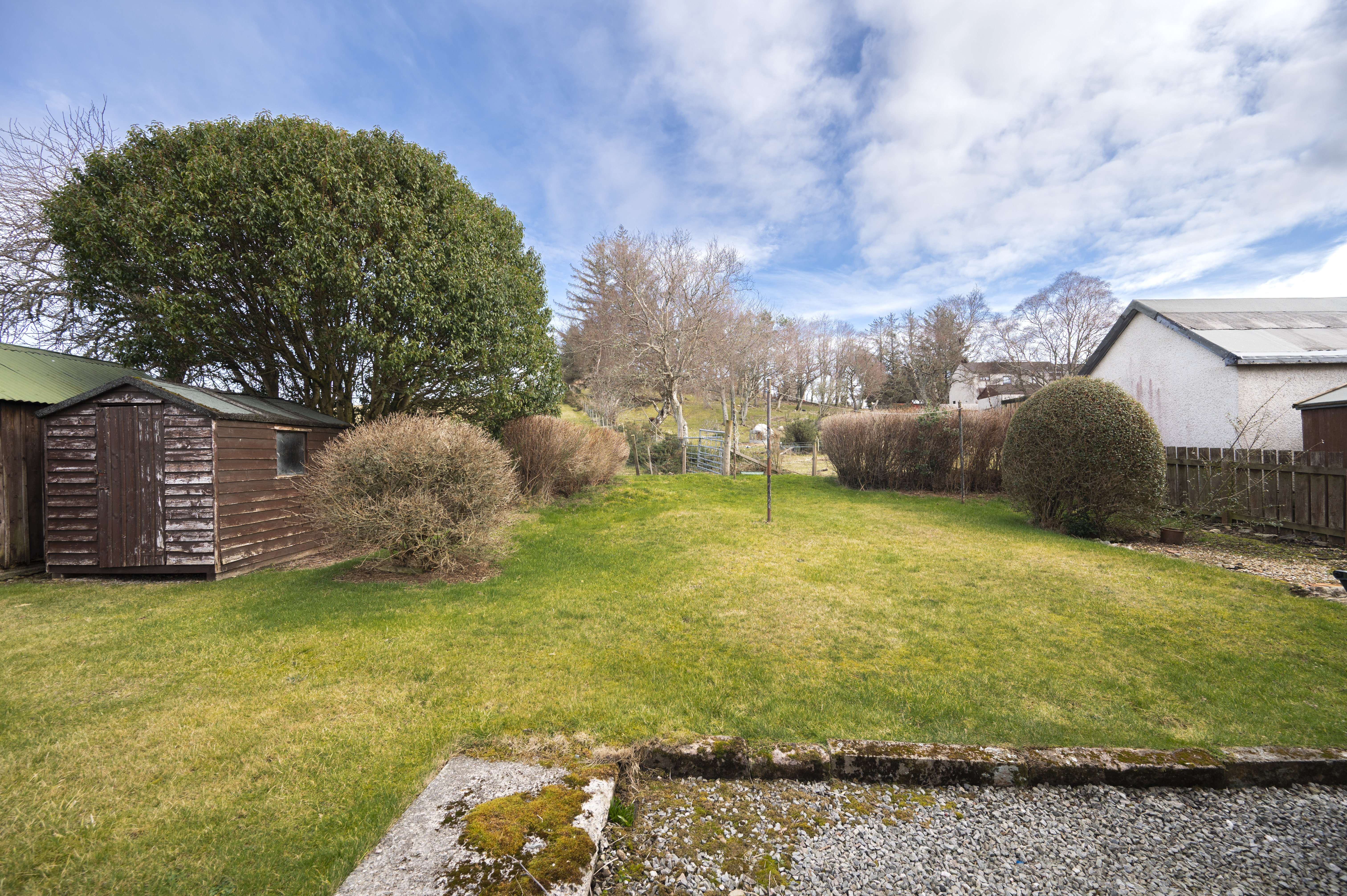 There are areas of garden ground to the front, side and rear which are laid to lawn for easy maintenance. A small timber garden shed is provided to the side of the property. Steps lead up to the front door.