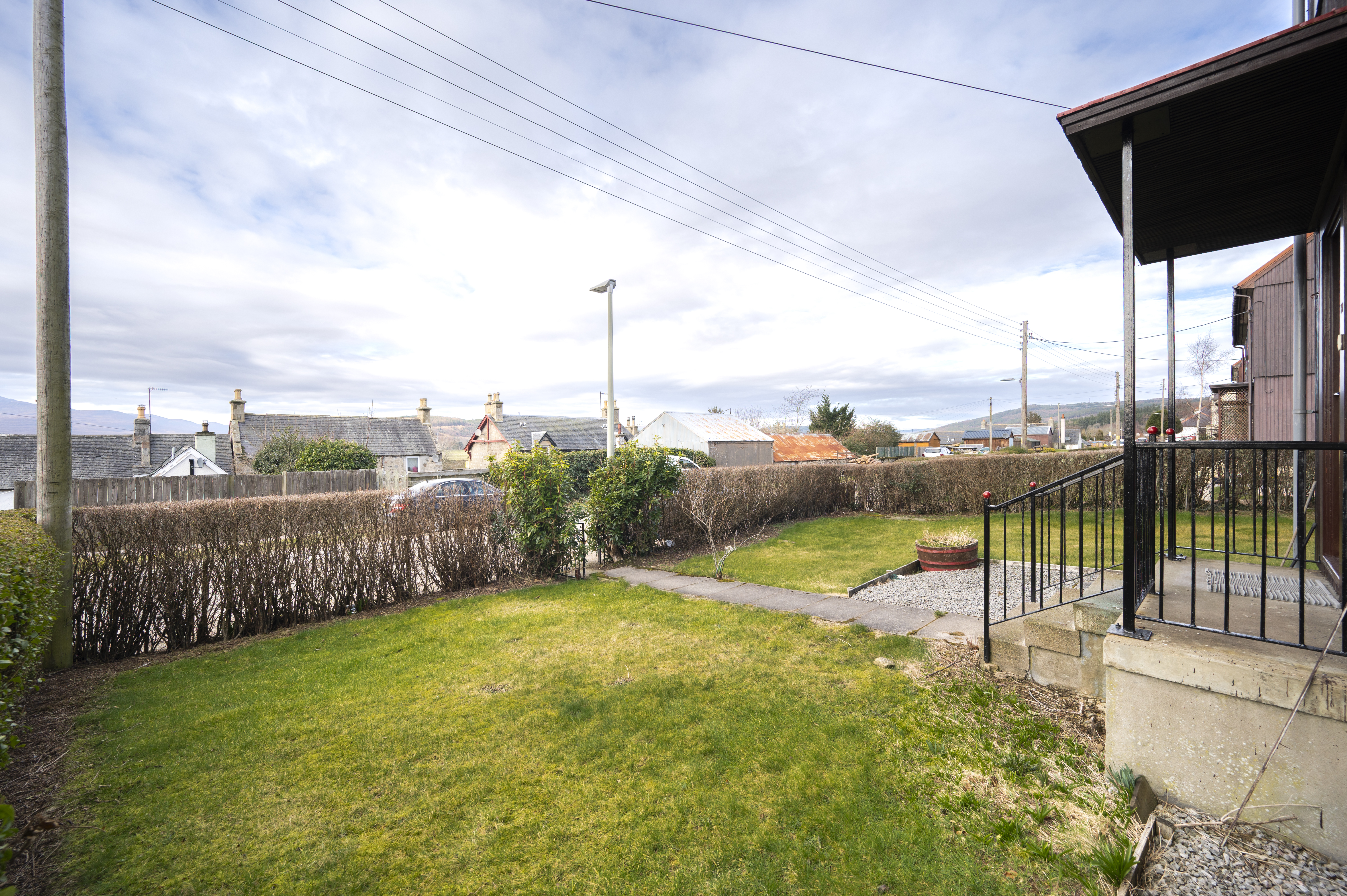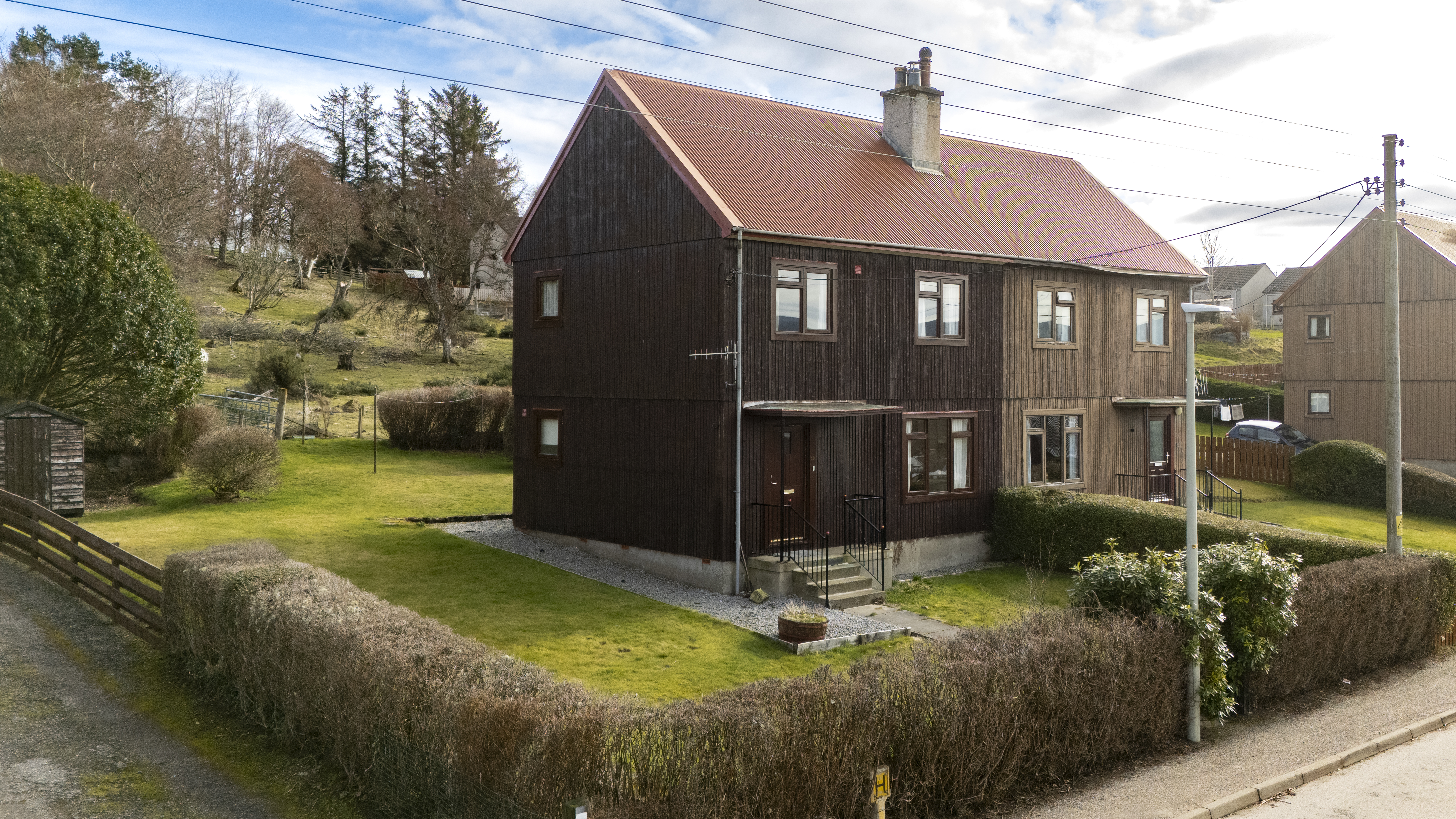 There are areas of garden ground to the front, side and rear which are laid to lawn for easy maintenance. A small timber garden shed is provided to the side of the property. Steps lead up to the front door.