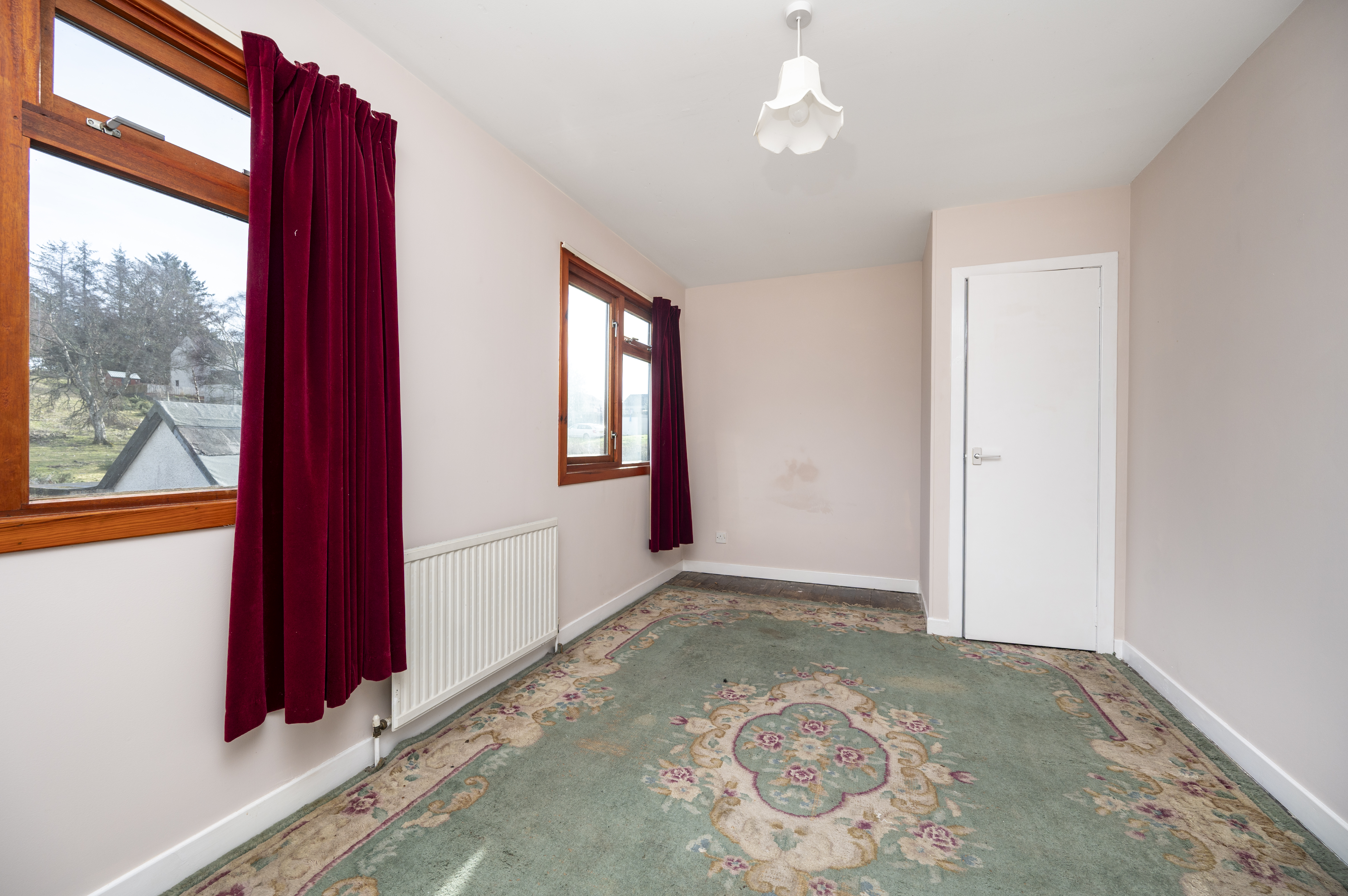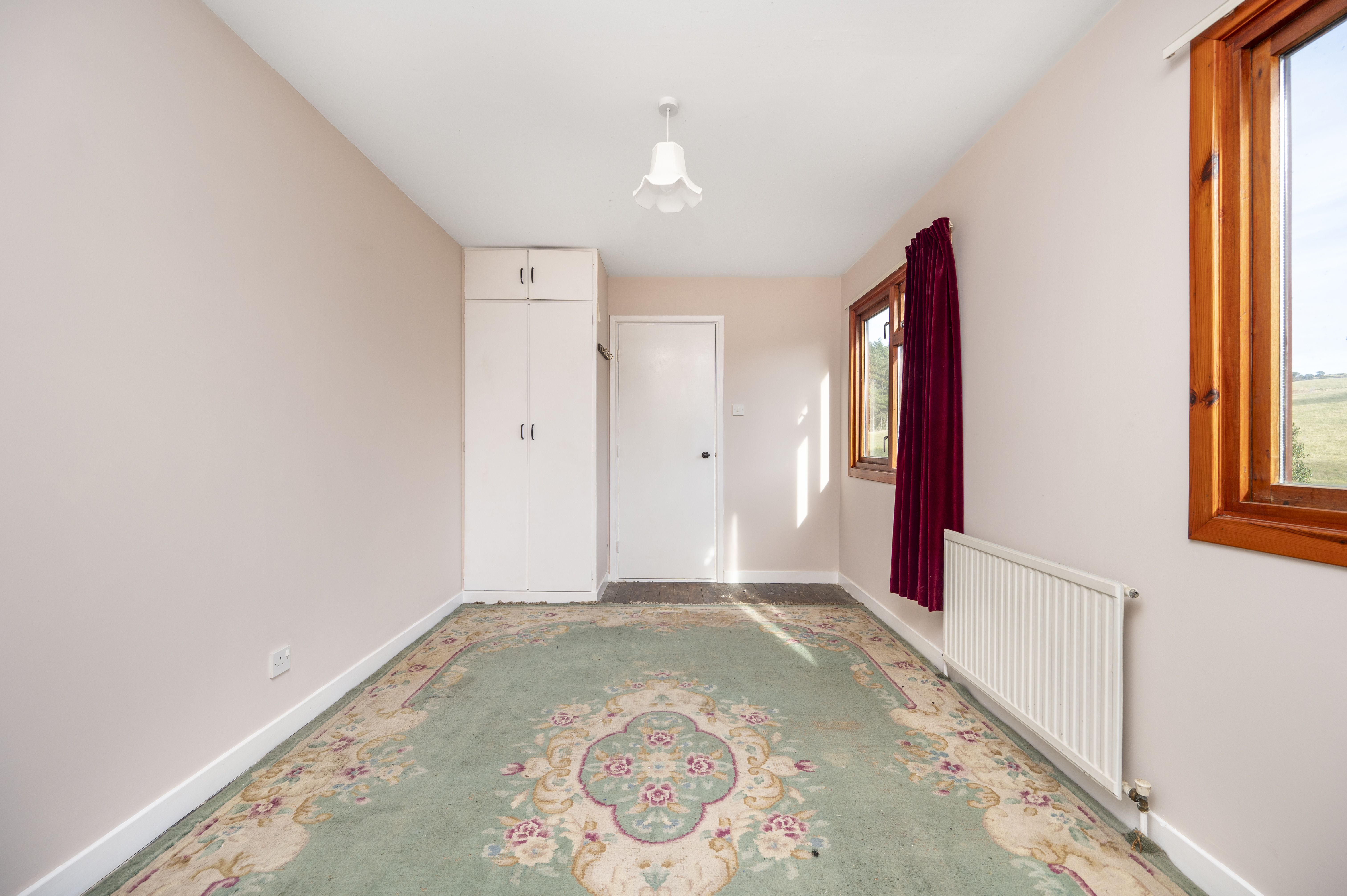 Another nicely proportioned room with front facing window enjoying views across to the hills. Built-in wardrobe with double doors and small cupboard above, shelving and hanging rail. Carpet. Radiator.