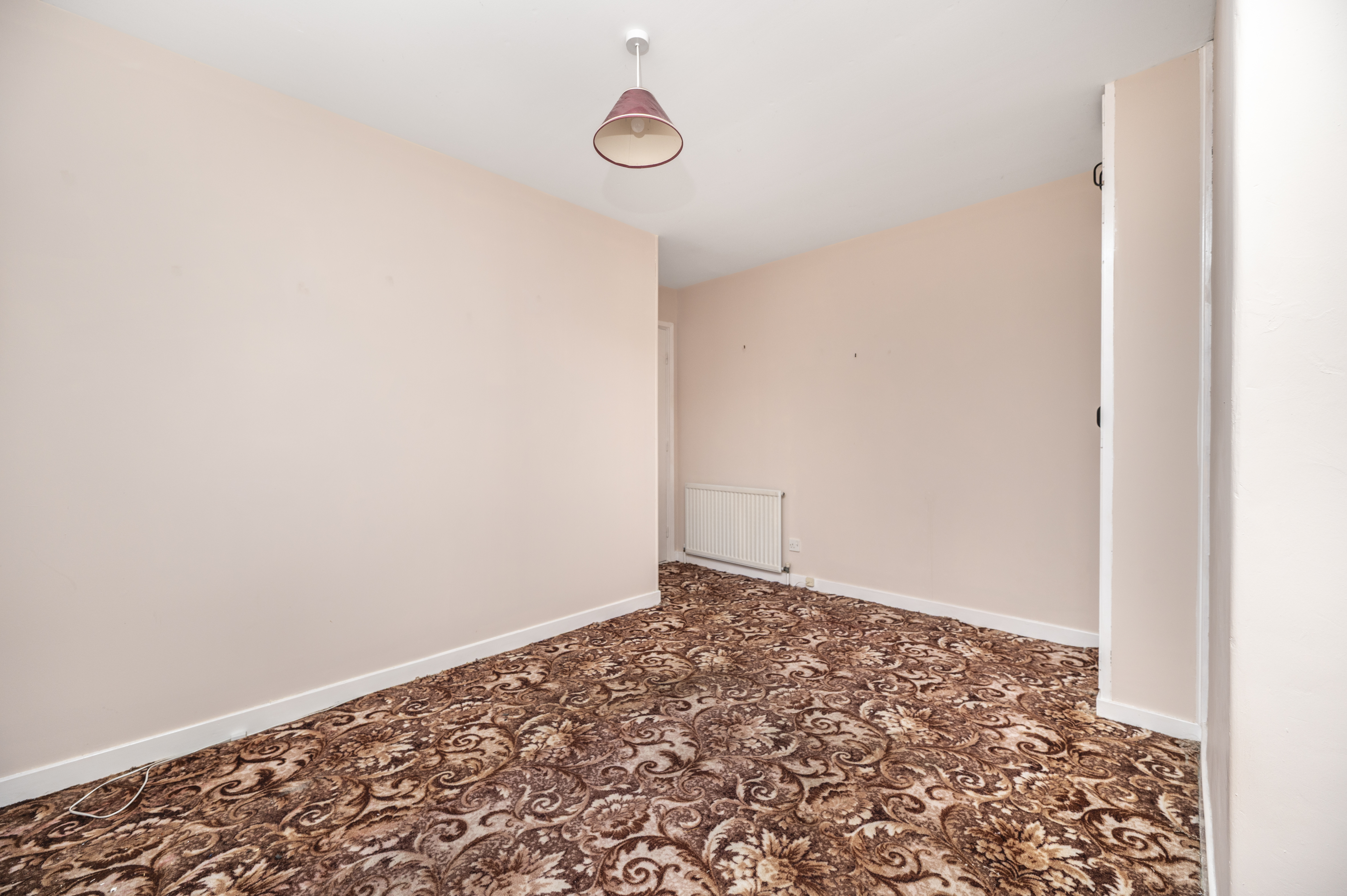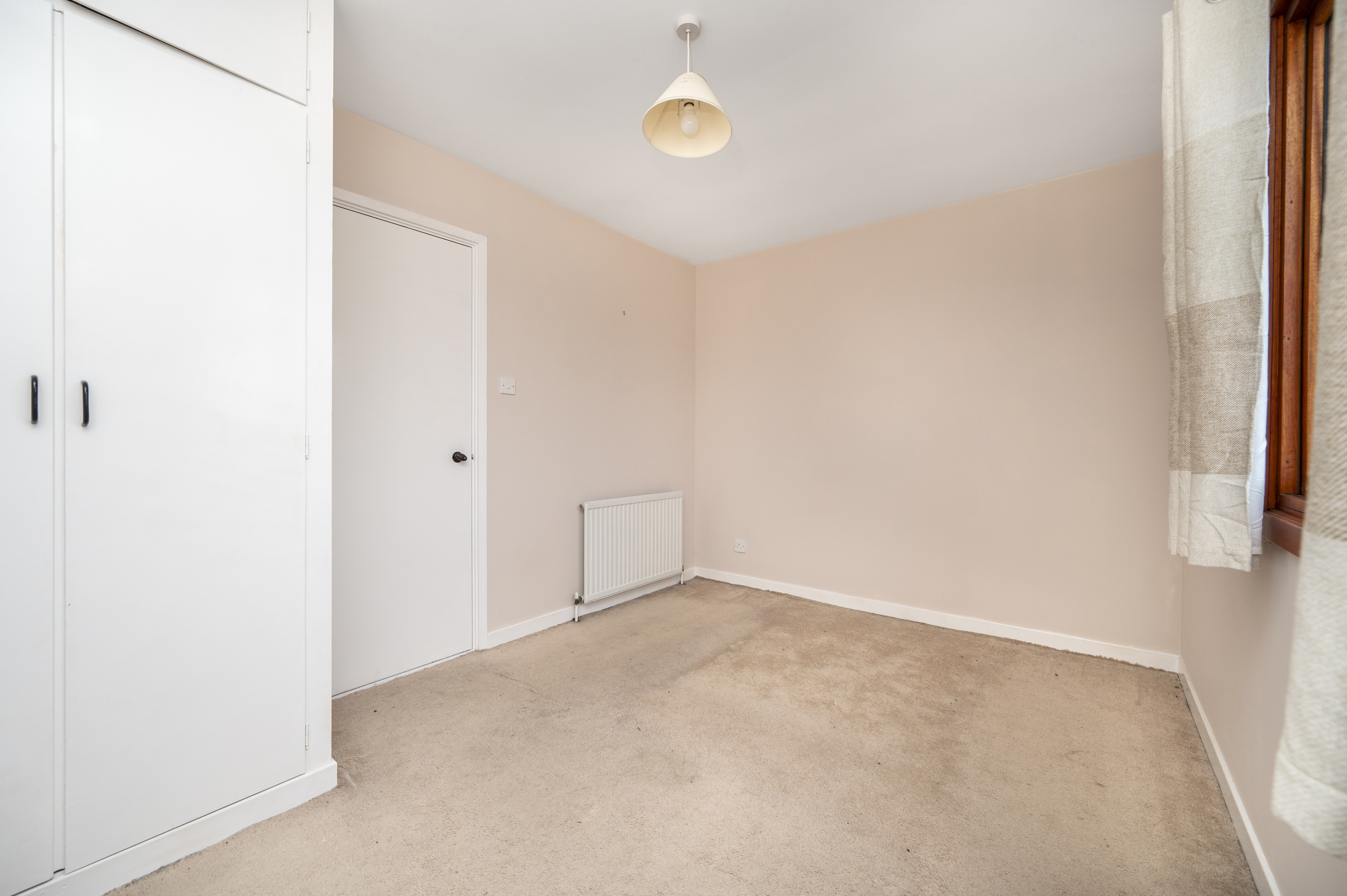 Enjoying two rear facing windows. Door into airing cupboard with slatted shelving, housing the hot water tank. Built-in wardrobe with shelving and hanging rail and small cupboard above. Carpet. Radiator.