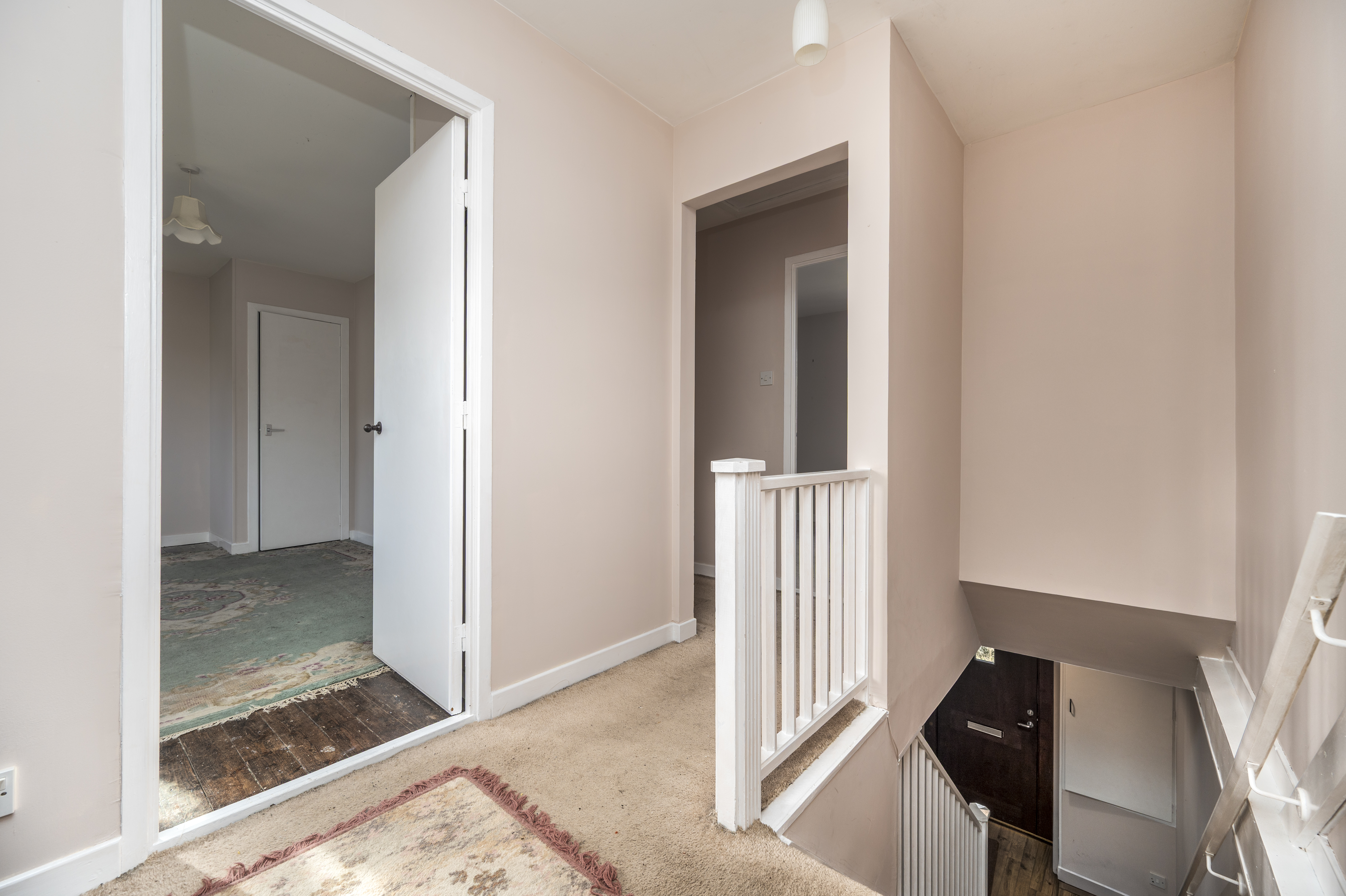Spacious and bright landing giving access to three double bedrooms. Side facing window. Built-in storage cupboards with display top. Carpet. Hatch to loft. Fitted coat hooks.